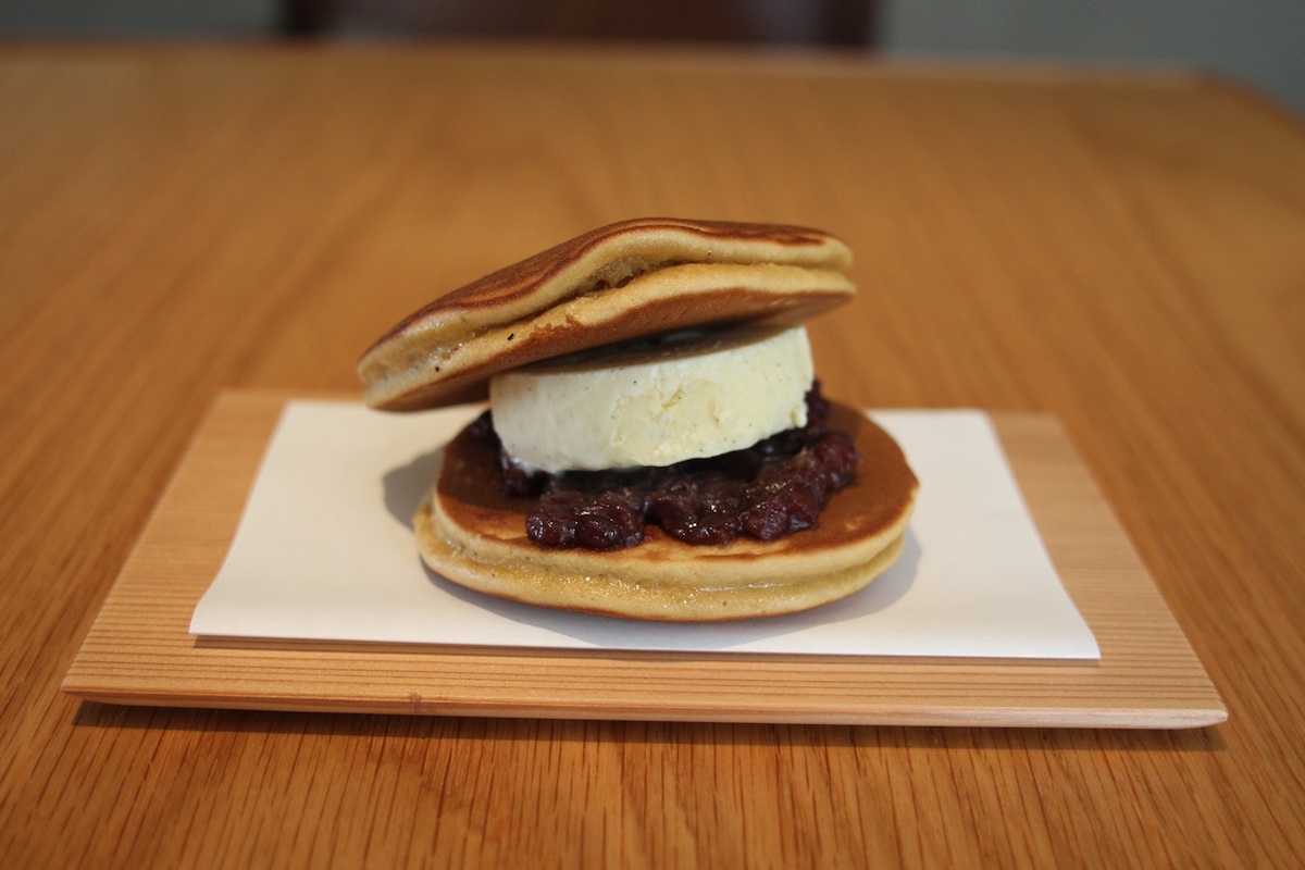 つぶ餡とバニラアイスクリームをサンドした「どら焼き」650円は、生地に関家の家紋をモチーフにした「翠門亭」のロゴマークが刻印されています。生地には和三盆やはちみつ、黒糖、きび糖など、さまざまな食材が入っており、甘みにも味の奥行きが感じられる一品。隠し味には白みそが入っているそう。