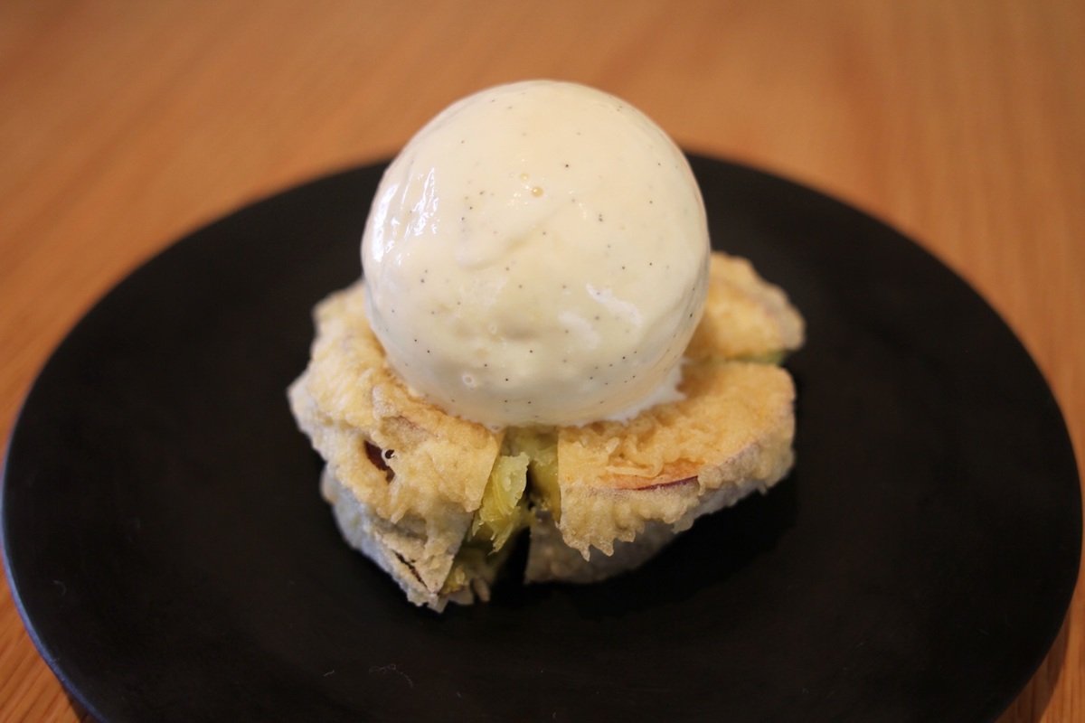 冬季限定の「アイス丸十」900円(3月末頃まで)は、30分かけてじっくりカリッと焼き上げたサツマイモに、バニラアイスをトッピングしたスイーツ。