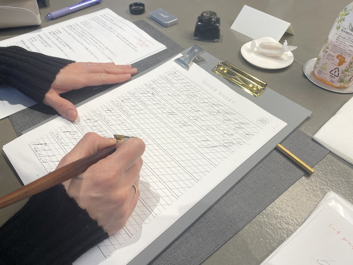 この日行われていたのは「モダンカリグラフィー」のコースレッスン。みなさん、おひとりさまでの参加で、1年以上通われている人ばかりでした。はじめは先生の書き方レクチャー、その後は実際に文字を書くという流れが基本だそう。集中して文字を書いたり、和気あいあいとお茶を飲みながら談笑したりとみなさん楽しそうでした!
