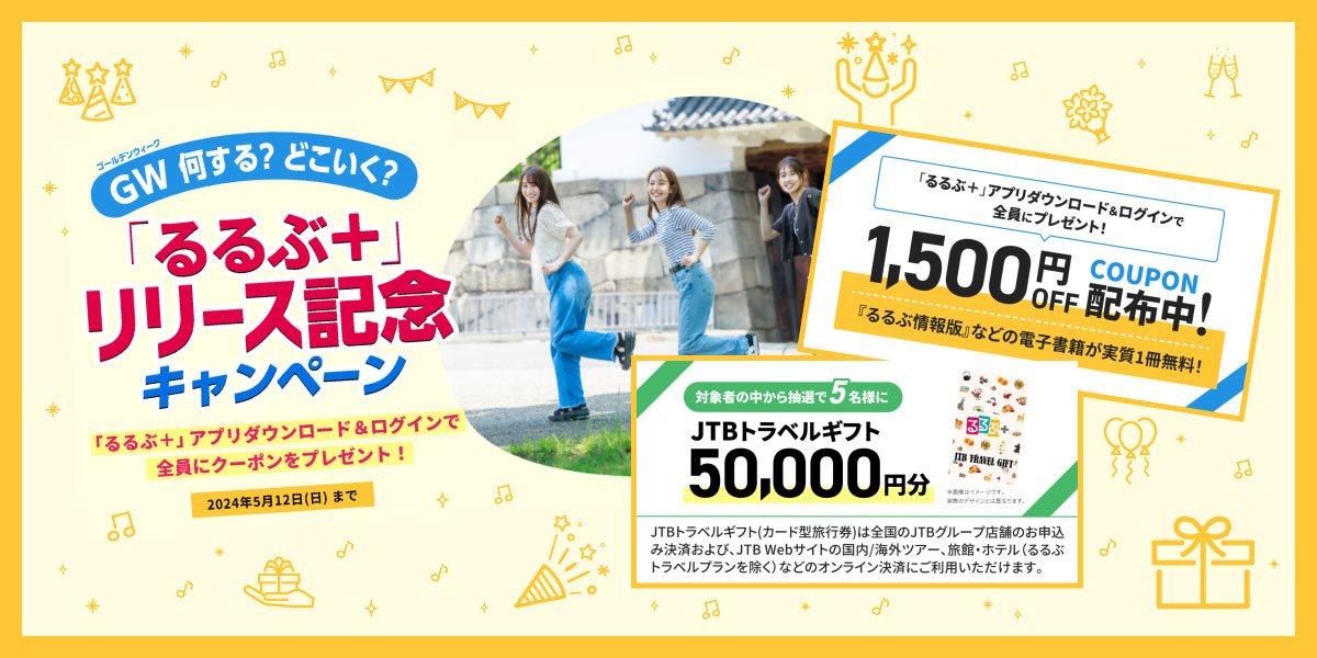 2024年5月12日(日)まで、「るるぶ+」アプリをインストールして、るるぶIDにログインすると、当社発行のほとんどの電子書籍が実質ほぼ無料となる1500円分のクーポンがもらえるキャンペーンも実施しています!さらに、JTBトラベルギフト5万円分が抽選で5名様に当たるWキャンペーンも実施中なので、詳しい応募条件や参加方法は、キャンペーンページをぜひチェックしてみて。