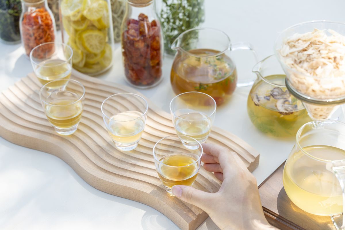ベースの「だし」には、「昆布」「かつお」「煮⼲し」を⽤意。それぞれ昆布とカツオ、煮⼲しと昆布という具合に、飲み⽐べをしながら好みの組み合わせを⾒つけたら、オリジナルの合わせだしの完成です。さらに、飲む「だし」のアクセントとなる「レモン」「マッシュルーム」「トマト」「にんじん」「ほうれん草」から好みの⾷材を選び、合わせだしへと投⼊。味の変化を楽しみながら、⾷材の旨味がぎゅっと詰まった⾃分好みの飲む「だし」を⾒つけることができますよ。