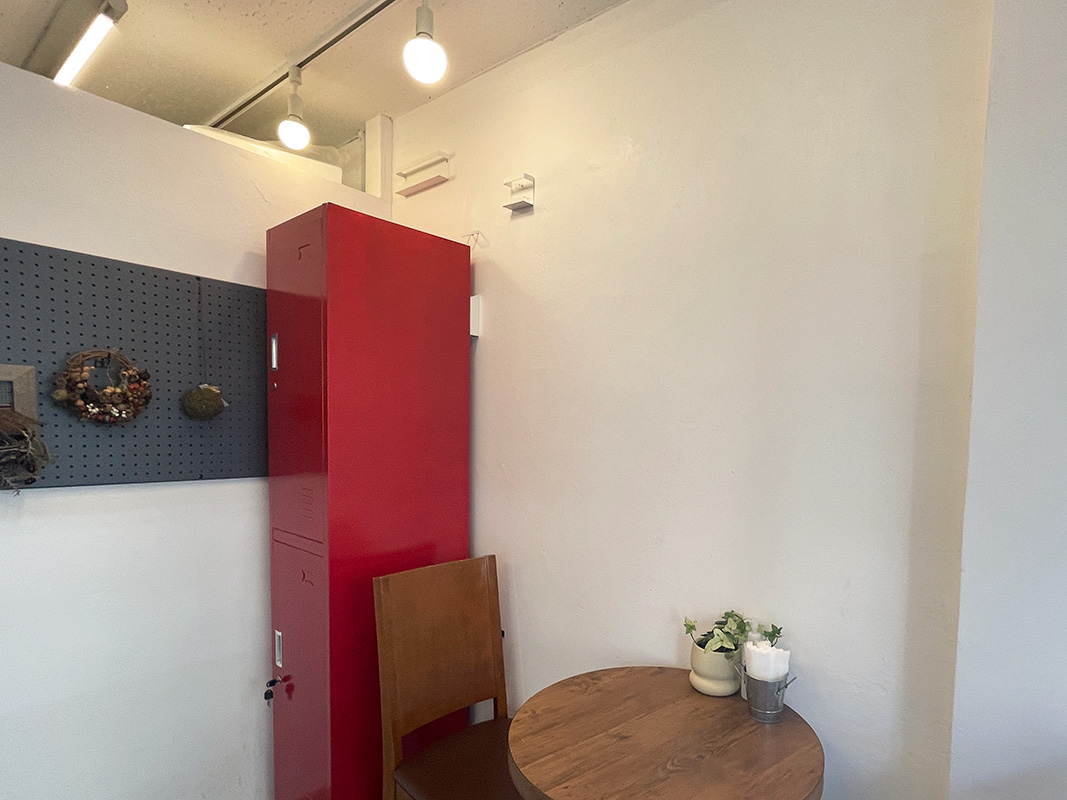 店内にも外観にも、あずきを連想させるえんじ色を取り入れているのがポイント。温かみのある電球と深みのあるえんじ色が、落ち着く空間を作り出しています。
