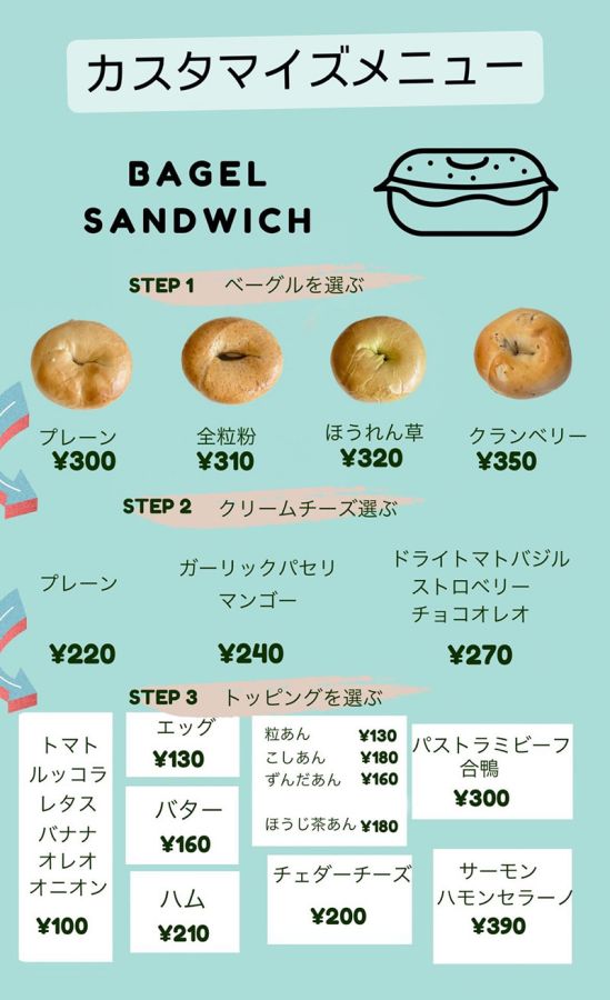 ベーグル、クリームチーズ、トッピングがそれぞれ選べます。