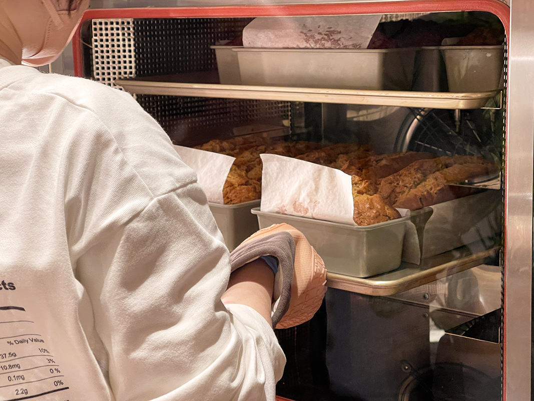 焼き上がったバナナブレッドがオーブンから出てくる瞬間は、思わず見入ってしまいます。