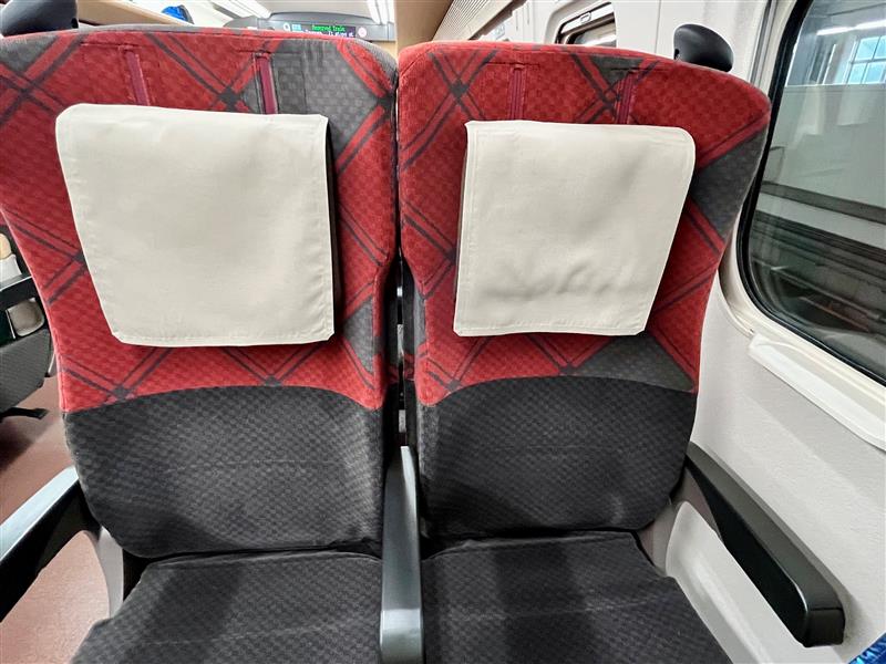 まずは赤を基調としたデザインが格好いい普通車両です。すべての座席分の電源コンセントが設置されています。