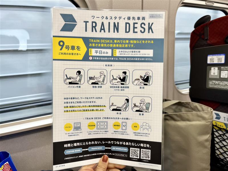 また9号車は「TRAIN DESK」といって、車内で通話や会議をすることができます。周囲に気兼ねなく作業できるので、ビジネスシーンにおすすめです。