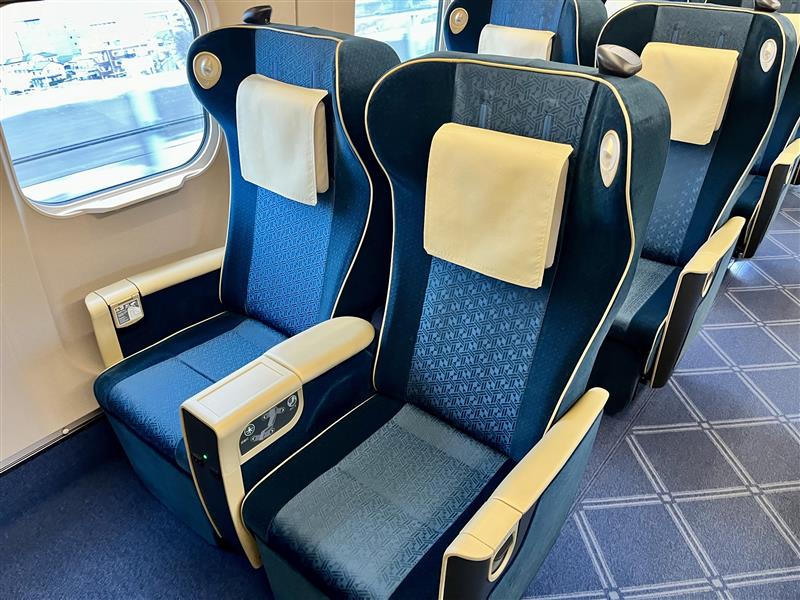 続いてグリーン車は、青を基調としたシックなデザインです。カーペットが敷かれており落ち着いた雰囲気を感じます。