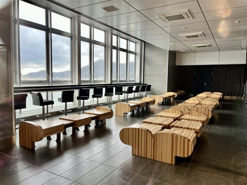 2階コンコースにある待合室も船をモチーフにしています。ユニークな形をしたベンチは港で船を係留するビットをイメージ。一貫したデザインのこだわりを感じられます。