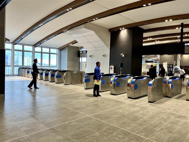 見て楽しいデザインだけでなく、利便性も兼ね備えています。乗換改札は19通路あり、混雑時も安心です。