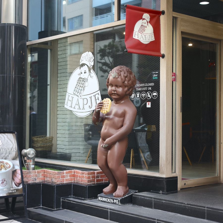 全国的に珍しいブリュッセルワッフルの専門店。目印はワッフルを持つ小便小僧。