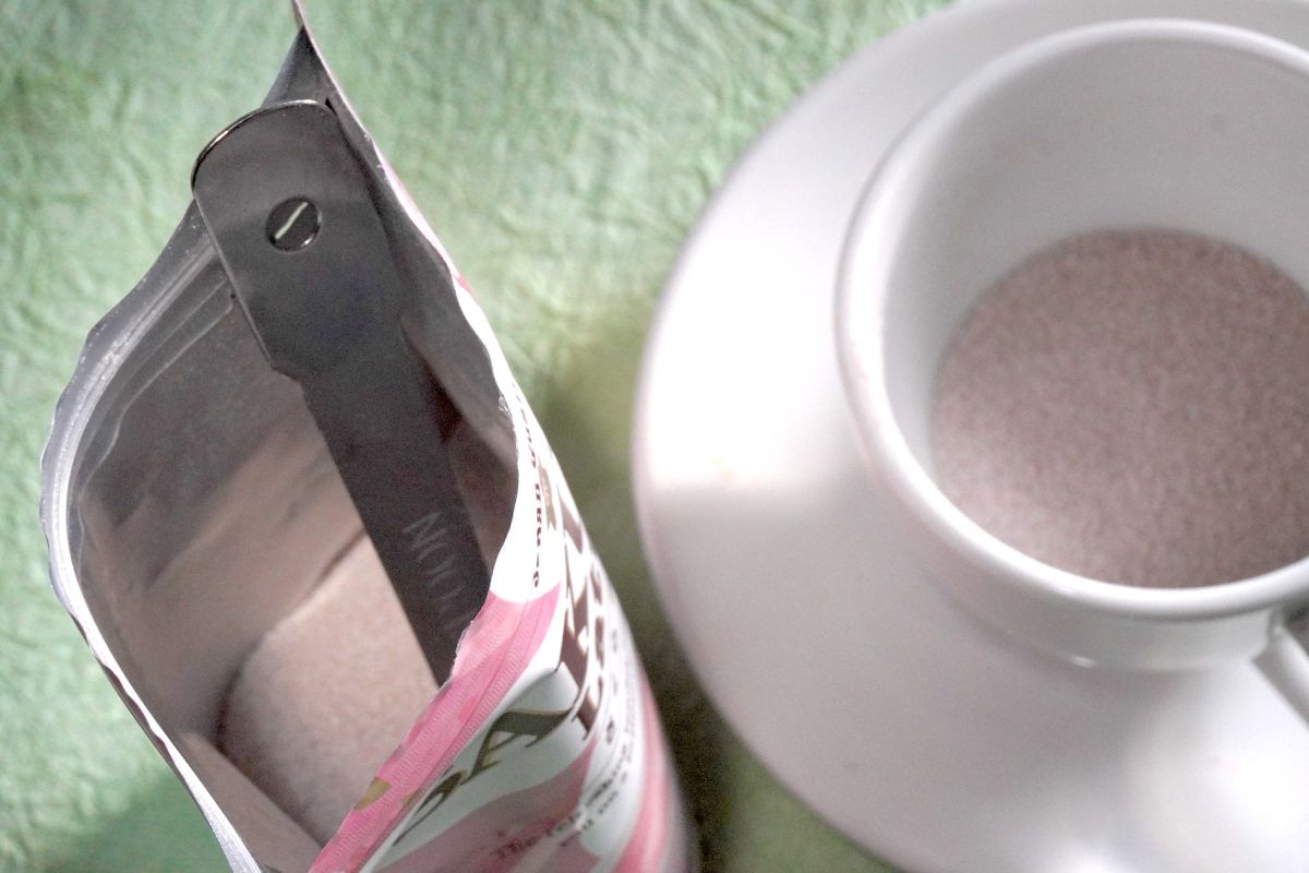 パッケージの中には、粉末で約13杯分が入っています。粉末状態のときは、ベージュに近い薄いピンク色。ホットで飲む場合は、ティースプーンで3杯(約8g)をカップに入れて、お湯(約100cc)を注ぎ、よくかき混ぜればできあがり。