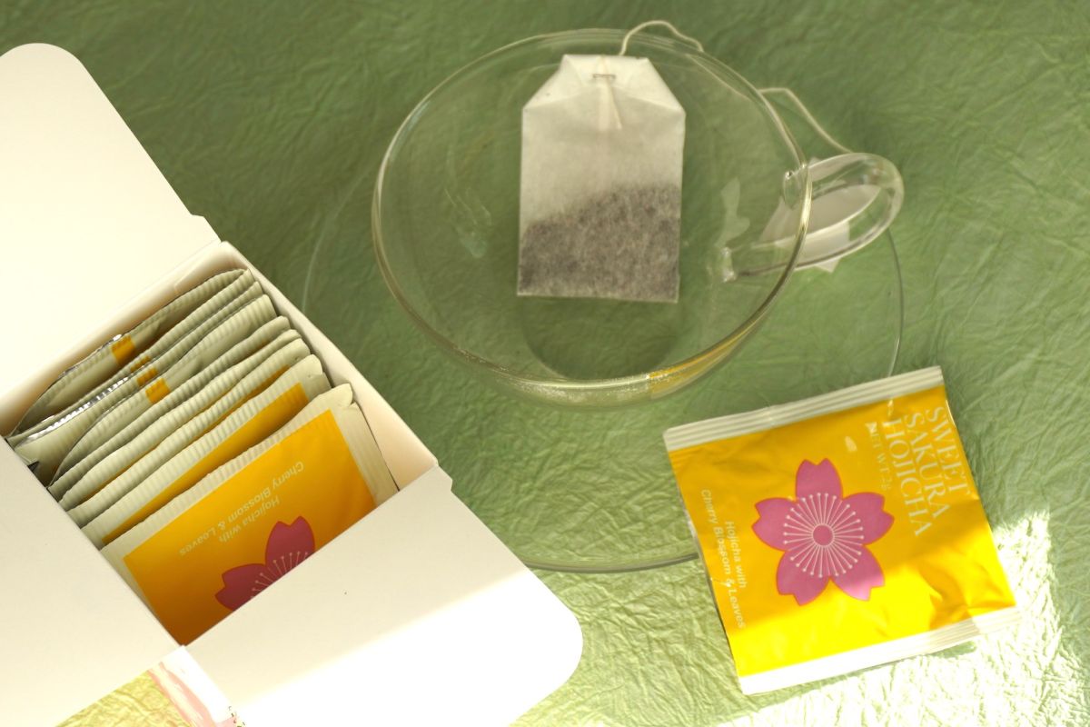 最後にご紹介するのは、ほうじ茶に桜花や桜葉をブレンドした「スイートサクラティー ほうじ茶 ティーバック」。日向に咲く桜の花をイメージさせる、明るいパッケージが印象的です。四角い箱のなかには10包のティーバックが入っています。