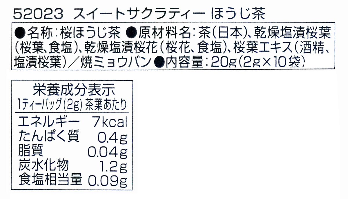 1ティーバッグあたりのカロリーは7kcal。使用されている桜葉や桜花は塩抜きされているので、食塩相当量は0.09gです。
