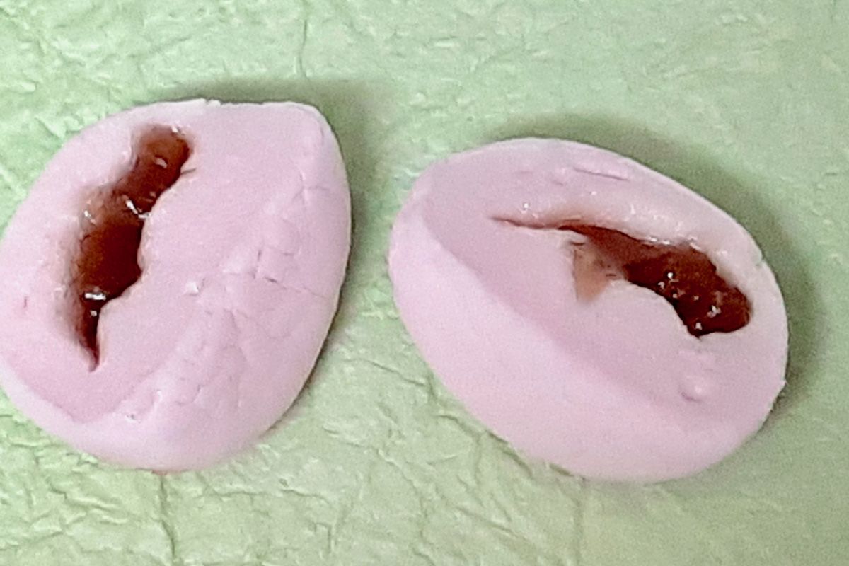 今回なかから出てきたのは直径約2.5cmの小さなマシュマロが9つ。淡いピンク色で、すべすべ、ぷよぷよの触り心地です。