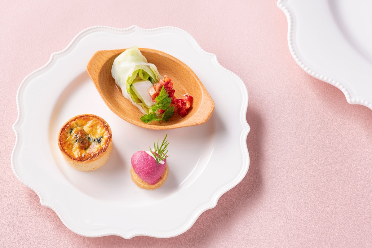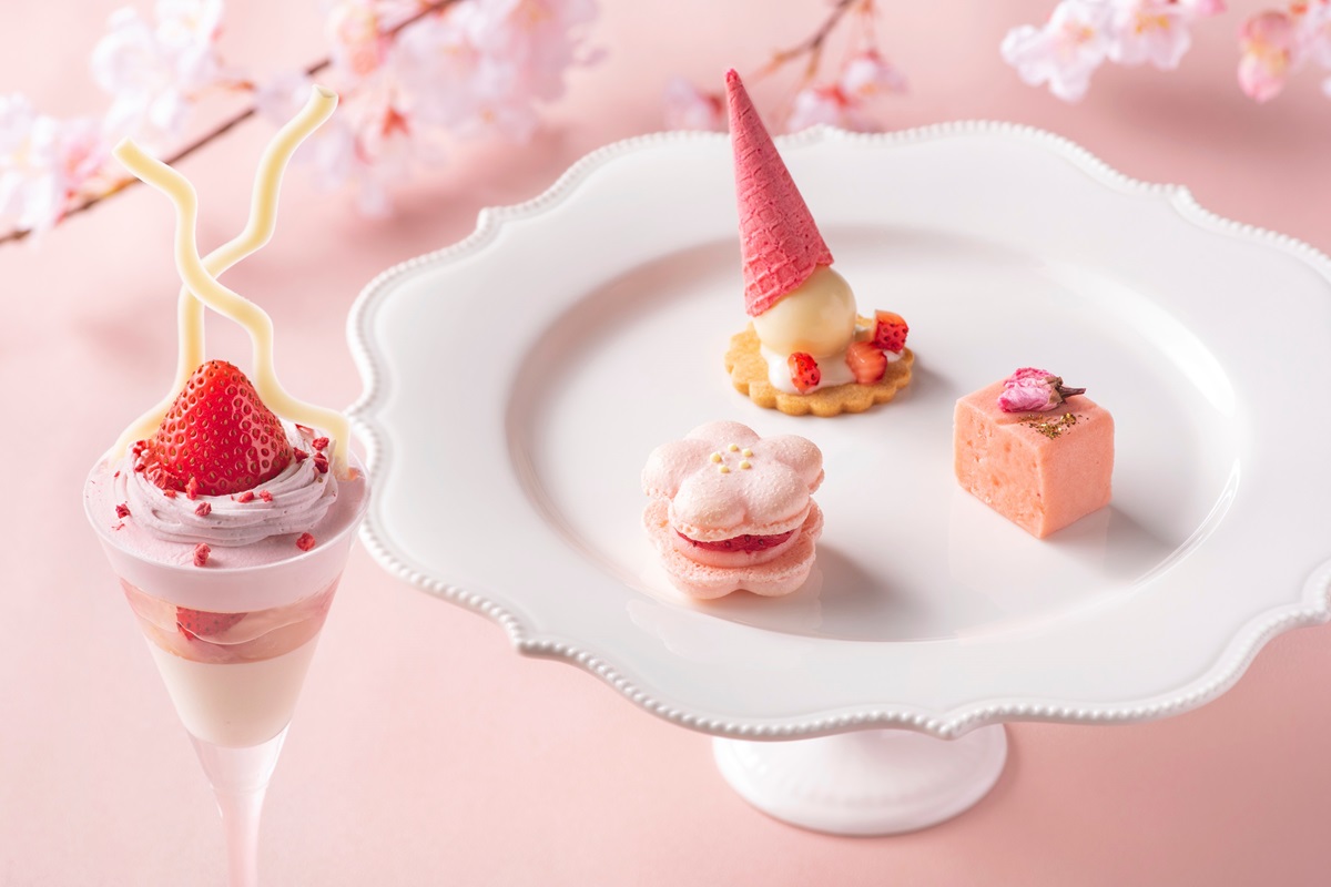 デザートには、お花見気分を盛り上げる桜餡入りのイチゴマカロンや、桜パウダーを合わせた濃厚なフロマージュテリーヌなど8種類を用意。セイボリーには、甘酸っぱく色鮮やかなイチゴのスイートチリソースで味わう生春巻や、1932年創業ハム造りの老舗「浅草ハム」のベーコンと旬のほうれん草を使用したキッシュなど6種類が登場します。