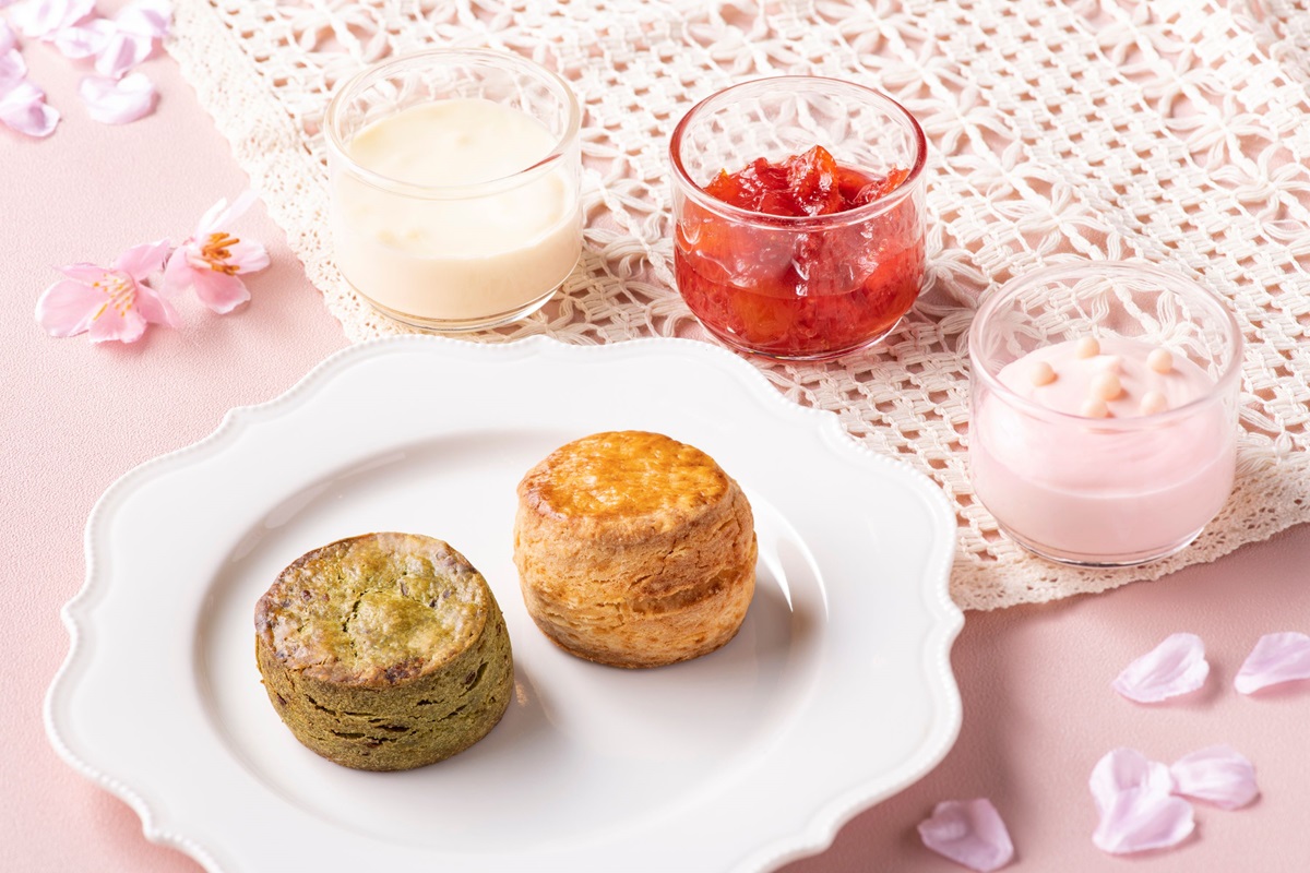 しっとりとしたプレーンスコーンと、小松菜の香りと小豆のほのかな甘さを堪能できるスコーンの2種類を用意。コンディメントはクロテッドクリームのほか、皮ごとシロップ漬けにしたキンカンとイチゴを一緒に炊き上げた「苺と金柑のジャム」、フランス産のクリームチーズに生クリームと桜のシロップ、バターを入れてコクを出し、風味付けに西京味噌を合わせた「桜と味噌のチーズクリーム」の全3種類。お好みのコンディメントをたっぷりとスコーンに付けて味わいましょう。
