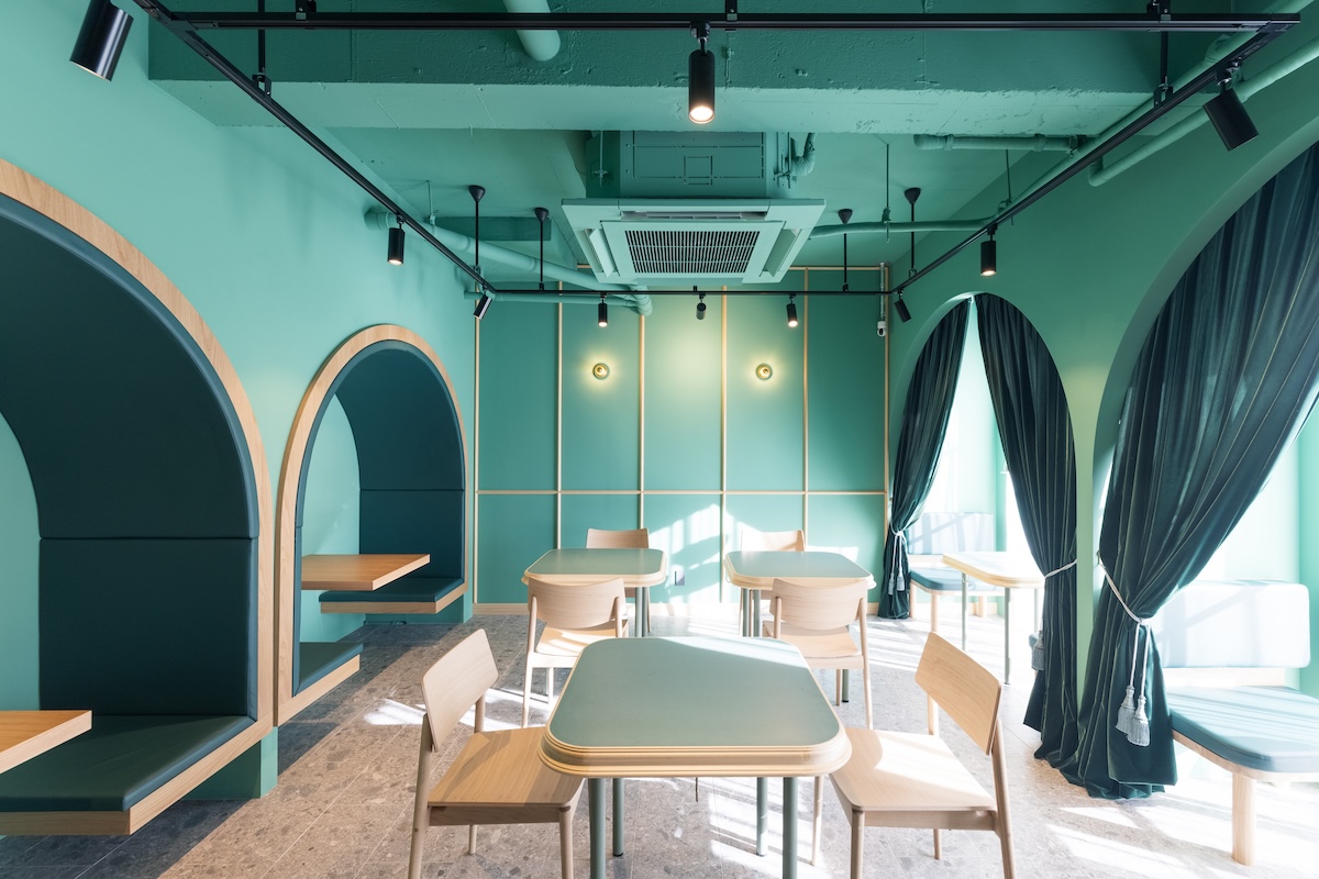 あたたかな木の扉を開けて中に入ると店内には、外観と同じターコイズカラーに彩られたアーチ構造のおしゃれな空間が広がっています。テーブルは7卓あり、距離がとられてるので対話に集中できそう。また、カウンターも8席用意されているので、おひとりさまも楽しめます。