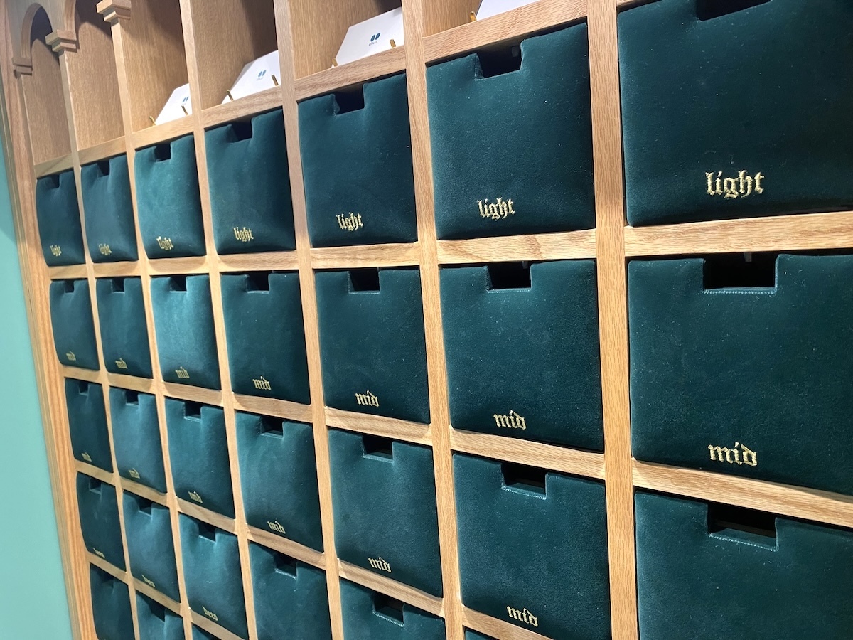こちらのたくさんの引き出しがある棚には、会話の種になる、3つのランダムなトークテーマが入った封筒があります。引き出しの上からLIGHT、MEDIUM、DEEP、と質問の深さを3段階用意。互いの関係性やその日縮めたい心の距離に応じてチョイスするのがおすすめだそう。