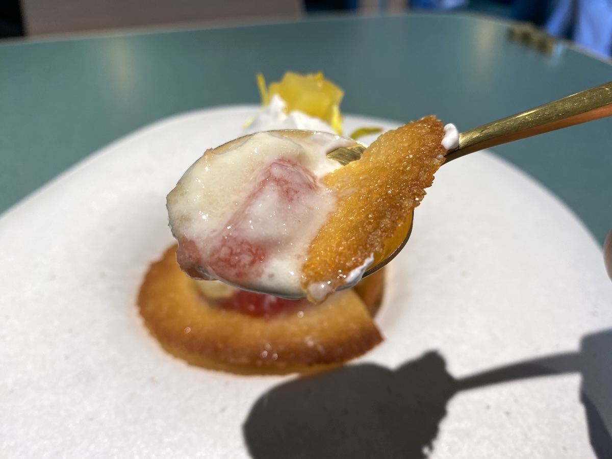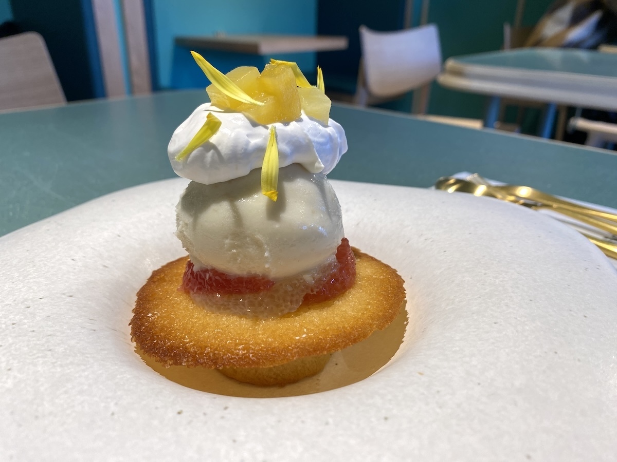 今回は、「トロピカルフルーツのババ」を選びました。パッションフルーツのシロップが染み込んだブリオッシュ生地をベースに、豆乳クリーム、グレープフルーツチュイル、ココナッツアイス、レモングラスシロップに漬けたパイナップルで構成されています。
