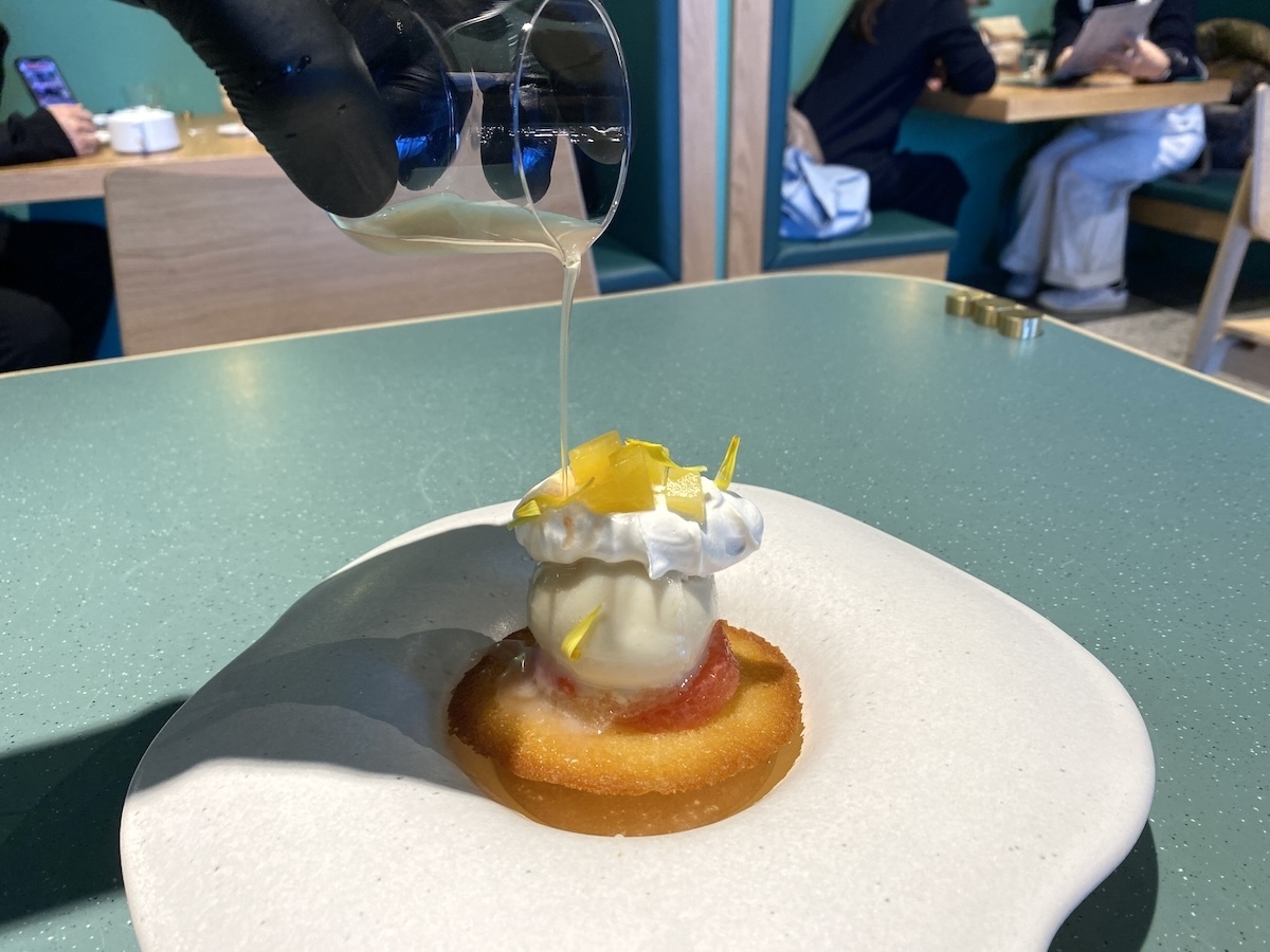 スタッフの方がグレープフルーツとエルダーフラワーのソースをかけて完成。目の前で行われるライブ感にワクワクしました!