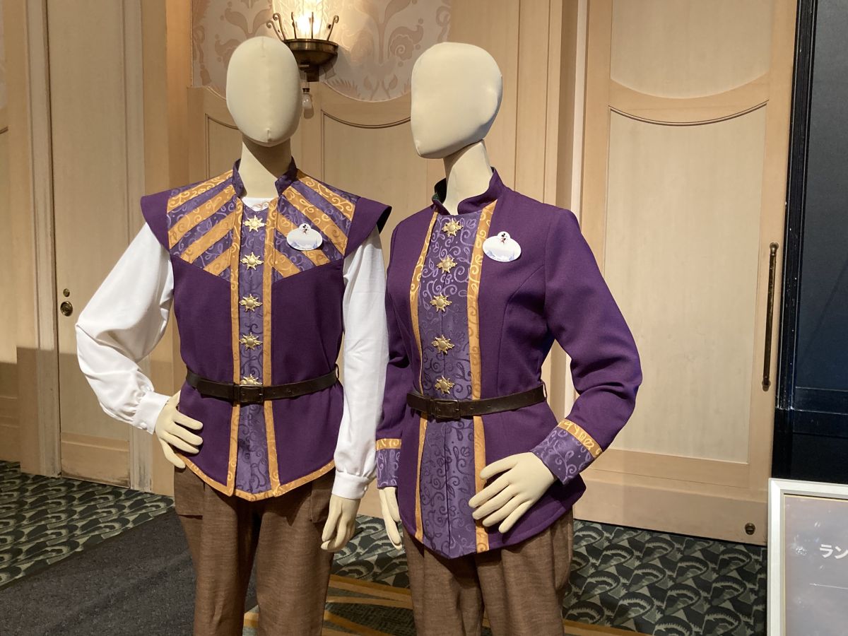 船大工という「ラプンツェルのランタンフェスティバル」のキャストコスチュームには太陽の紋章のボタンが。ランタンをイメージさせるオレンジとラプンツェルをイメージさせる紫色でエレガントな装いに。ボートハウスのオーナーの下で働いているので、どちらも動きやすいパンツスタイルになっています。