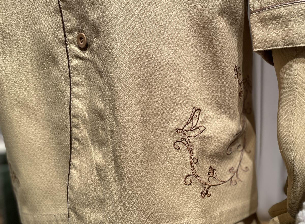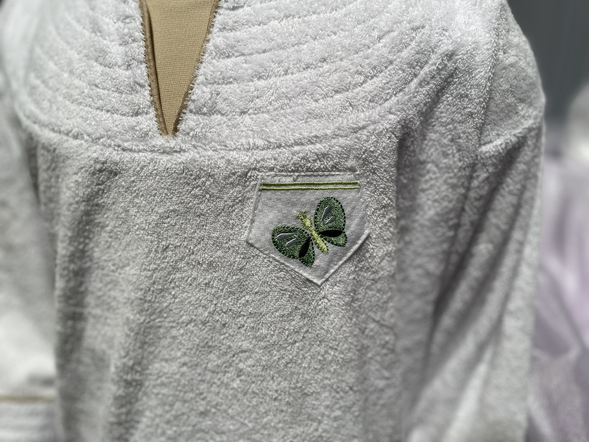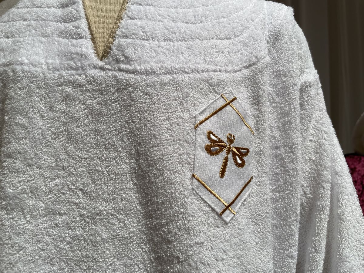 スリッパは先が覆われたラウンドタイプ。ホテルのロゴ入りでふわふわのパイル地に底も厚めで履き心地もよさそうでした。こちらのパジャマにはトンボ刺繍が。