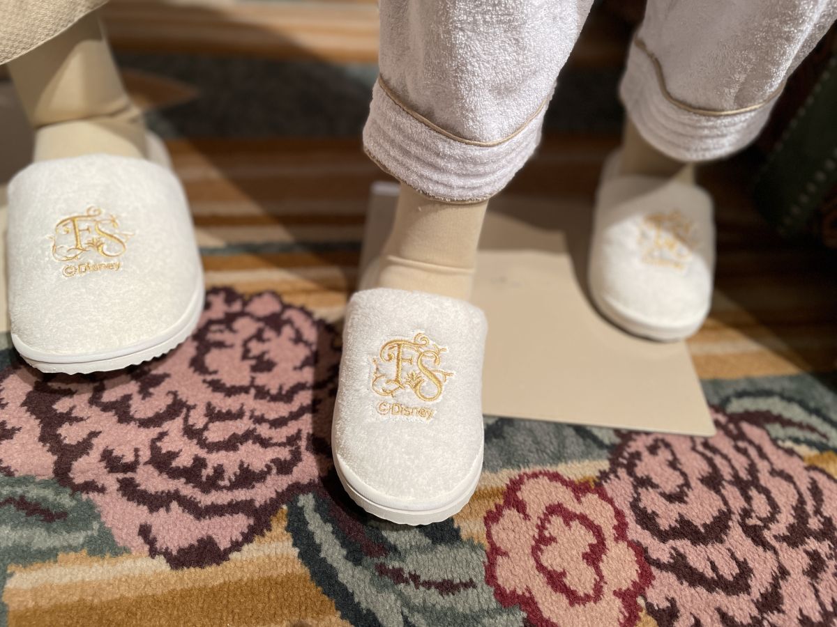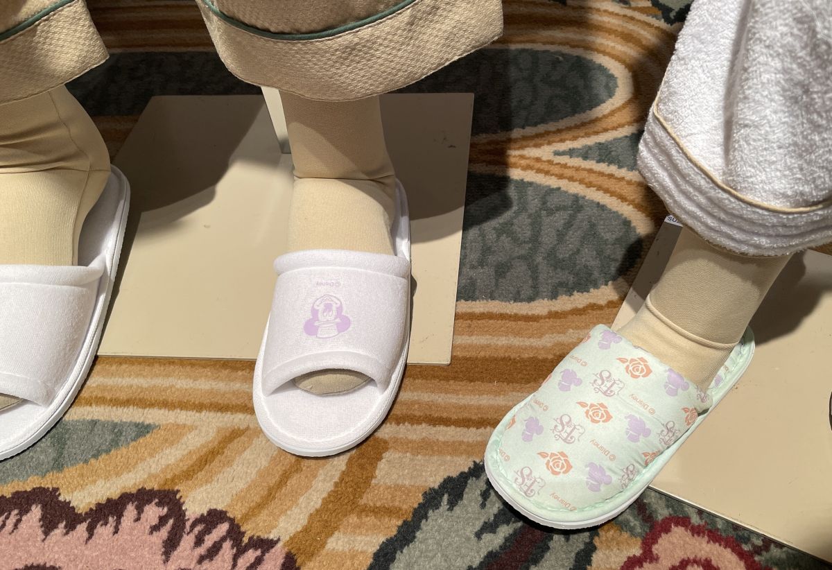 持ち帰りOKなスリッパはミッキーのイラスト入り。パジャマにはちょうちょの刺繍がワンポイントに。