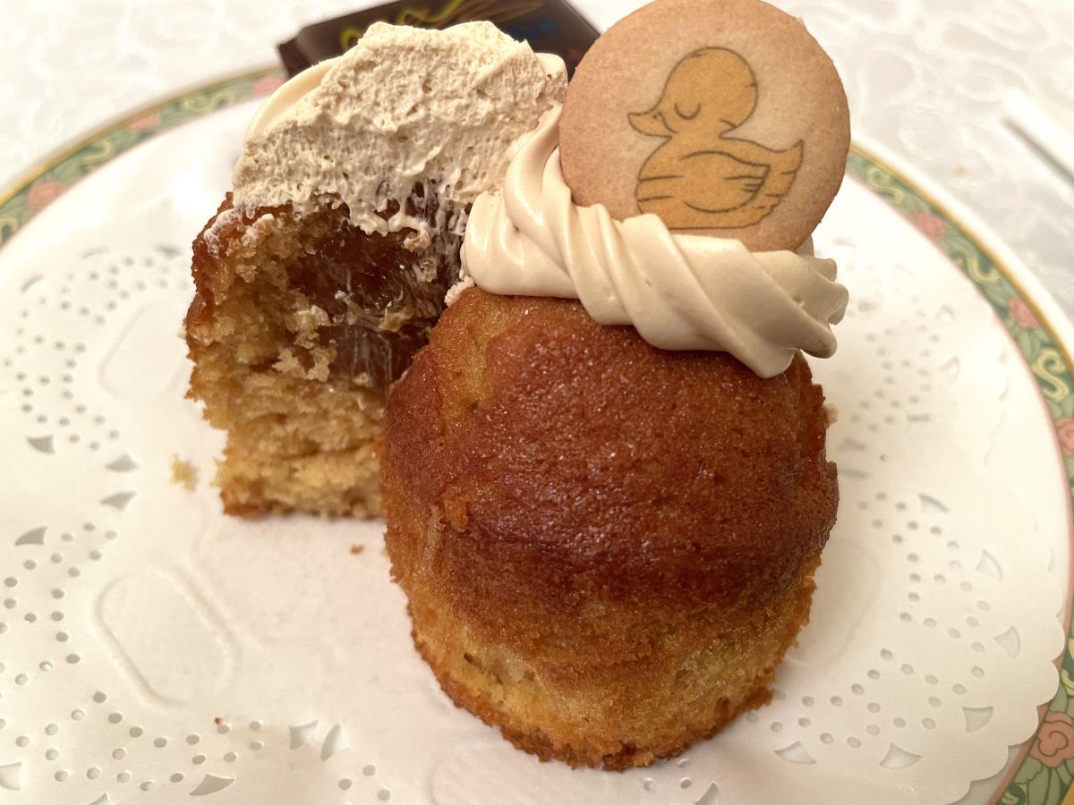 「ダックリングマフィン(キャラメル)」はしっとり食感のマフィンで、中にはペースト状のキャラメルがイン。上のクリームもキャラメル味と、キャラメル好きにはたまらない味わい。上のクッキーもサクサクでおいしかったです。