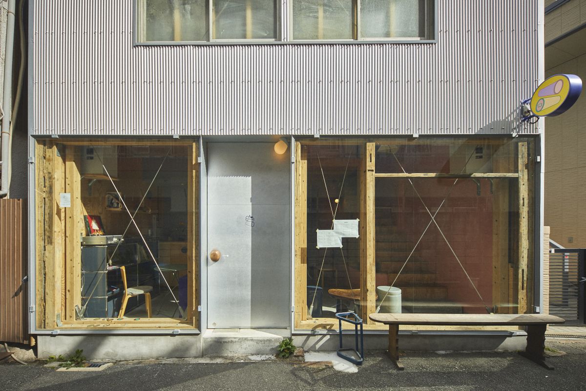 歩いているだけでも楽しい街、中崎町の少し外れに「π spectacle」はあります。外から見ると、トタン外壁、構造材を剥き出しにしたような柱、壁がわりにした窓を支える鋼材の筋交いが見えて、一瞬工場かな? と思うようなインダストリアルな雰囲気。