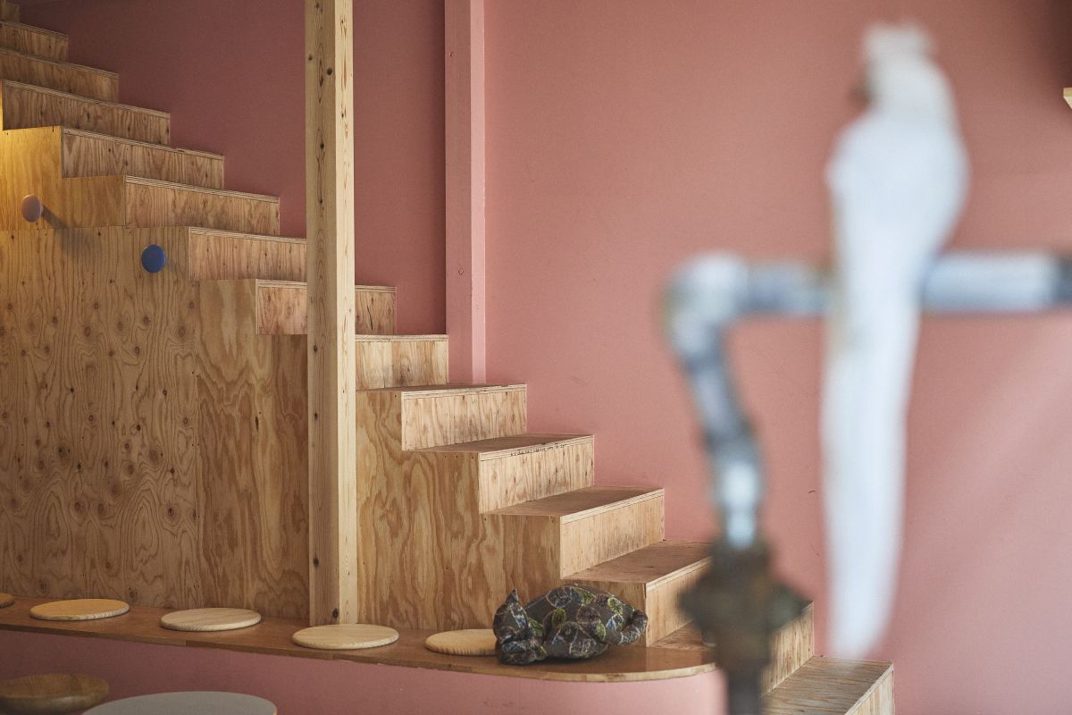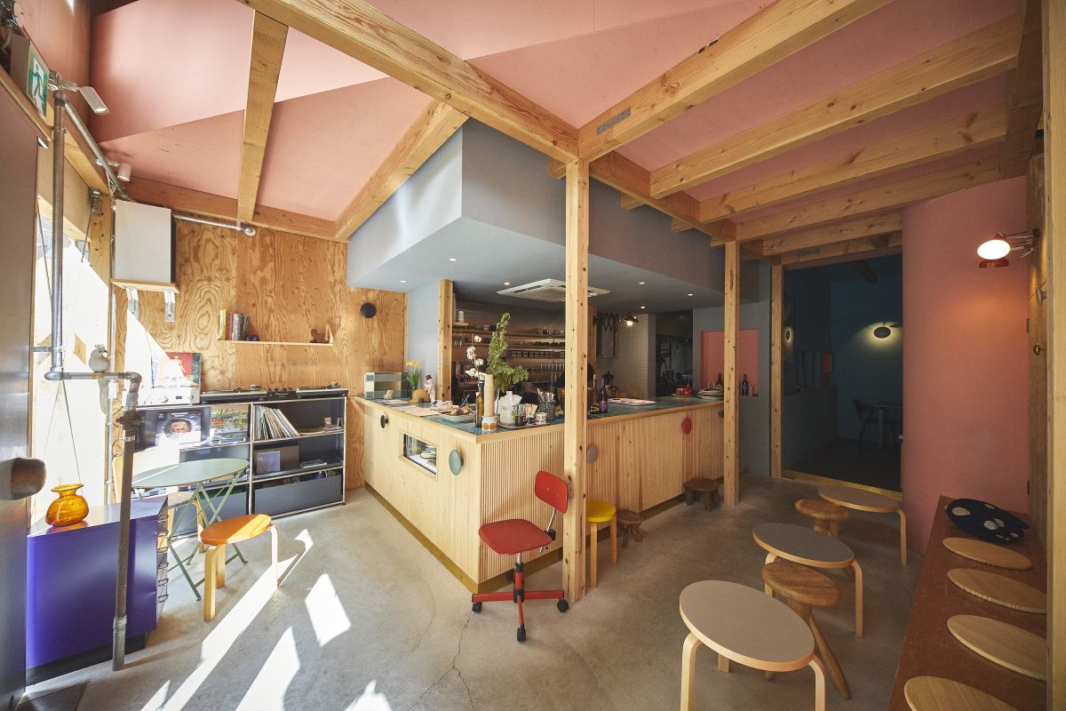 中に入ると、明るい暖色系の天井、Artek Aalto(アルヴァ・アアルト)のテーブルのモダンな形や色がやわらかい空気を生みだしています。カウンター前に一脚設けられたテーブル席は、一部ペット同伴可。この日も小型犬を連れたお客さまがお茶休憩されていました。