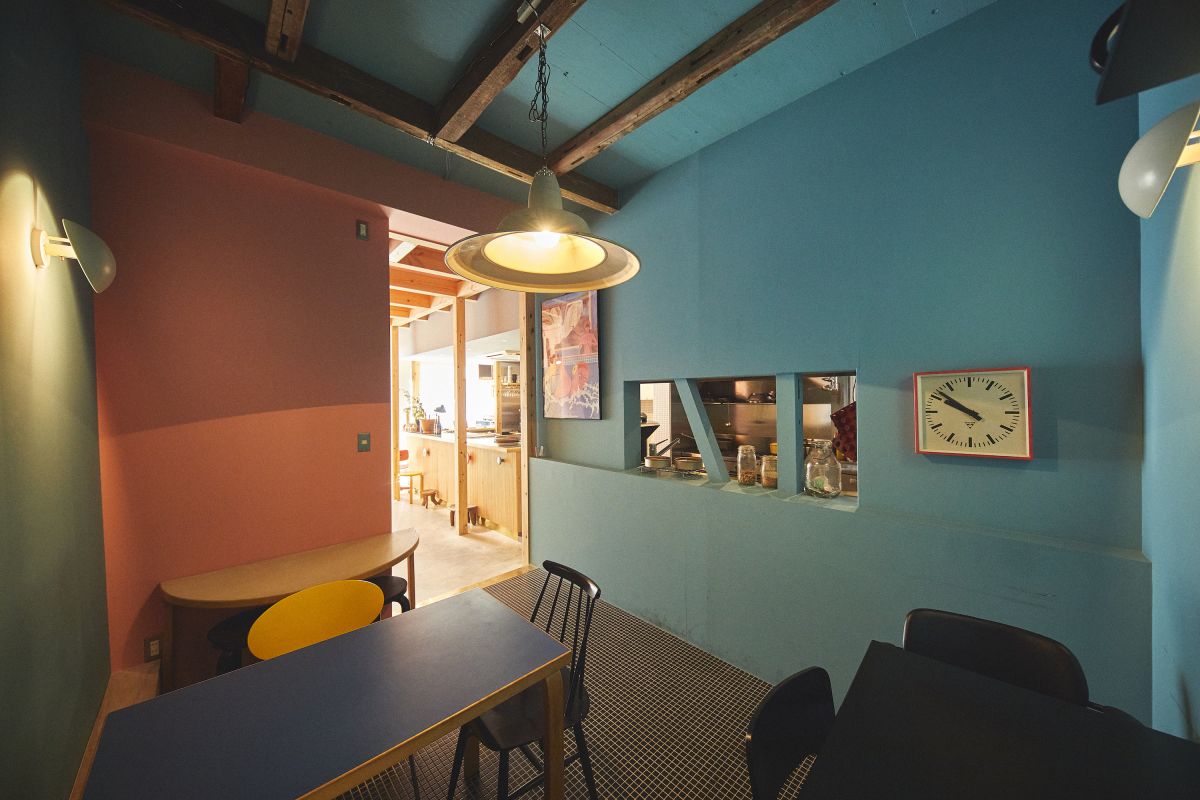 「π spectacle」の魅力の1つは、選んだ席によって表情が違うこと。例えば、1階カウンターの奥はターコイズブルーの壁に囲まれた半個室的な空間になっています。カップルで利用すれば、ちょっぴりお忍び気分を味わえそうだし、お子さん連れでもゆったりとした時間が過ごせそうです。