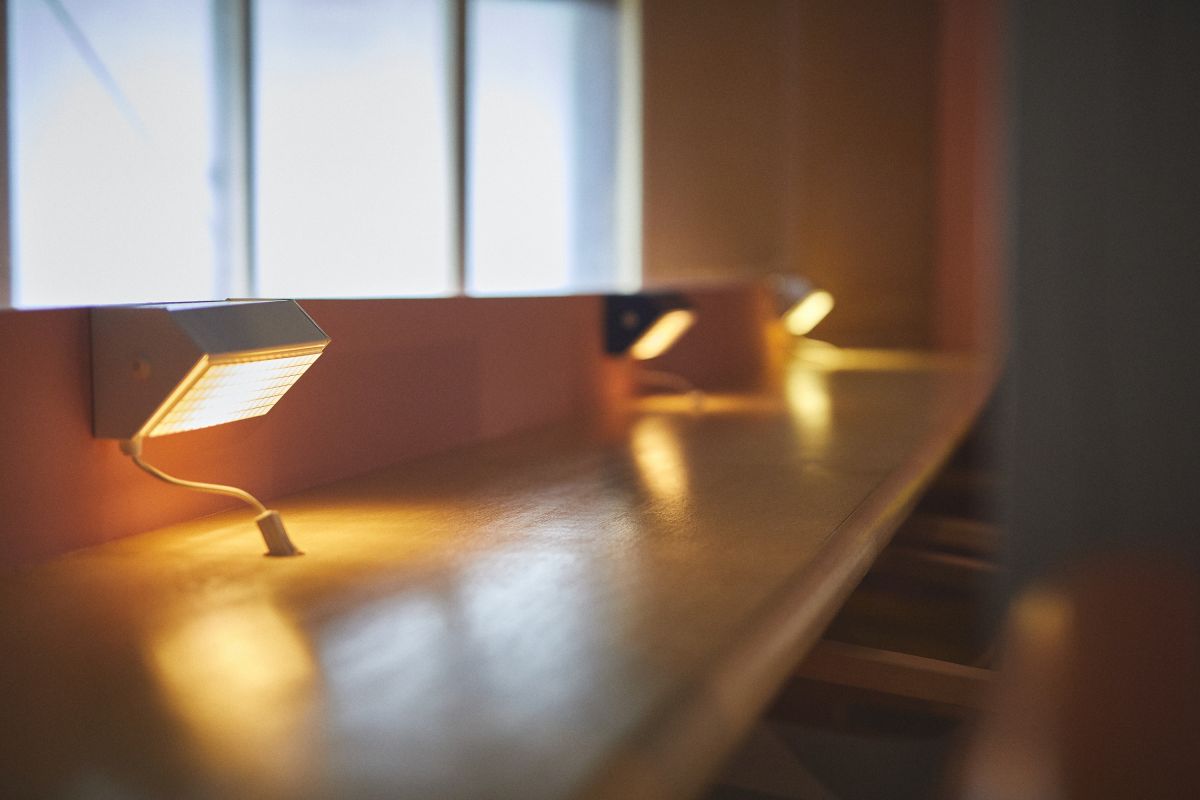 フラットな空間なのに、家具の配置によって仕切られているように感じるのが不思議で、正面の窓側に面した席はおひとりさま仕様。リモートワークや携帯の充電ができるようにコンセントも完備されています。デザイン性に優れた照明は「アルネヤコブセン」。