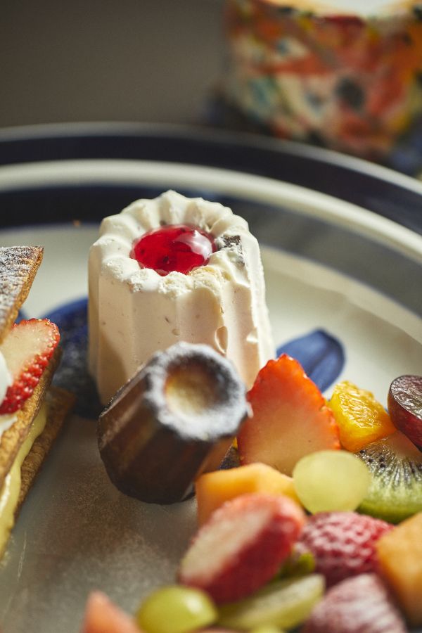 この素敵な空間にぴったりな「アシェットデセール」。丁寧に仕込んだパイ生地を毎朝その日の分だけ焼き上げるミルフィーユを主役にしたひと皿は、パイ生地がなくなれば終了する数量限定の一品。