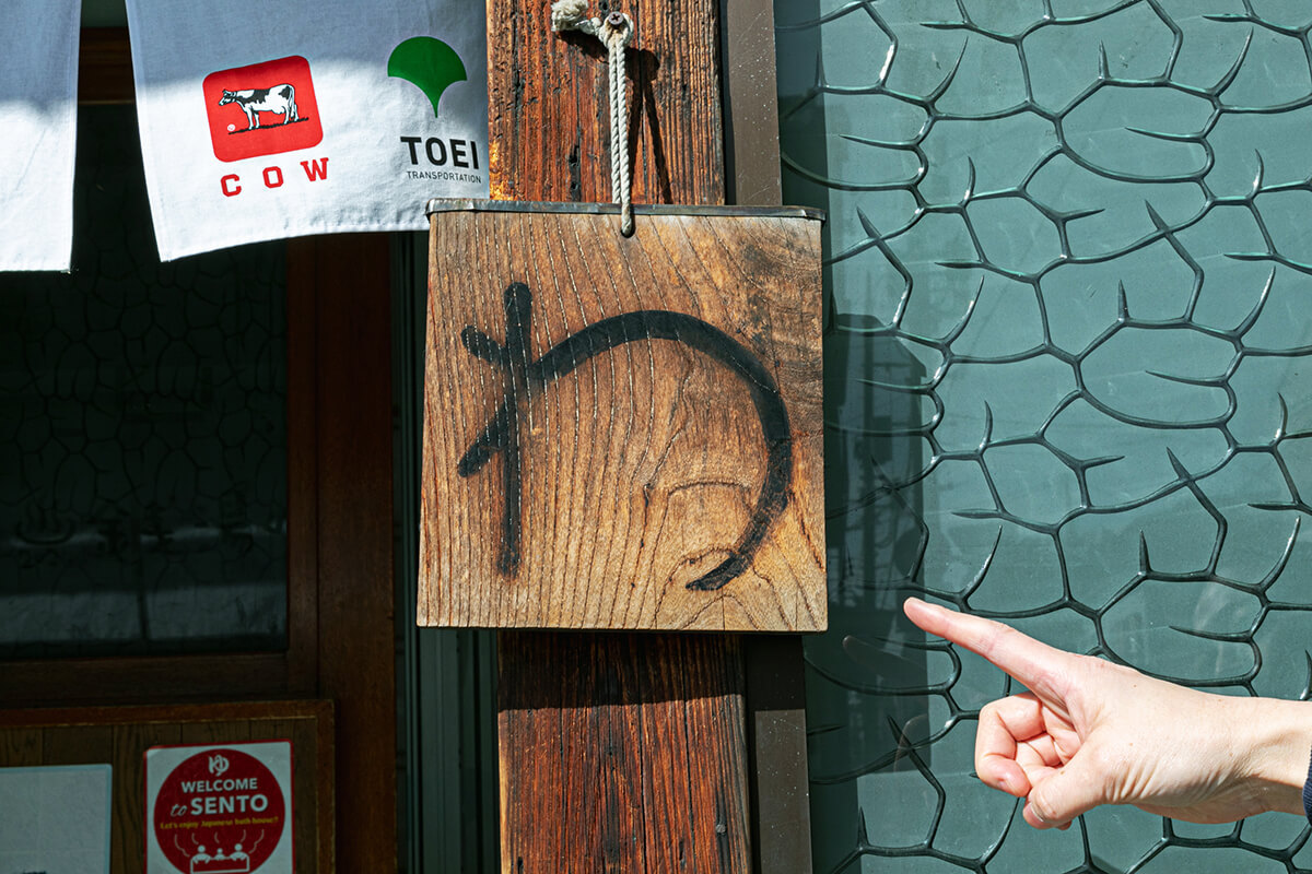 銭湯の入り口では、このような「わ」と書かれた板を見ることがあります。「わ」の「いた」=「わいた」で、「お湯が沸いた」=営業中を意味します。しゃれの聞いたこの看板が銭湯で使われるようになったのは比較的最近のことで、銭湯芸術家・ウエハラヨシハルさんによるものだそうです。
