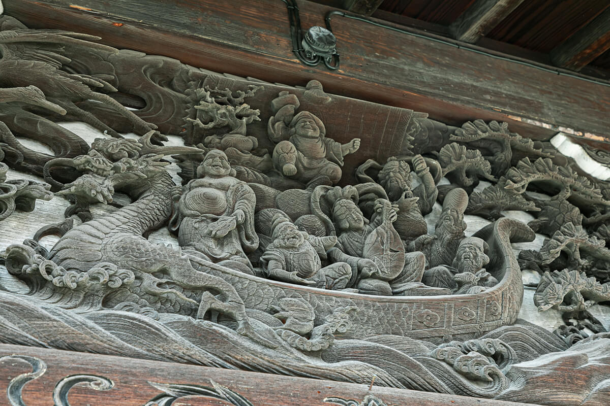 のれんの上部には、七福神が宝船に乗る様子が一枚木に透かし彫りされています。葛飾の柴又帝釈天の門前にある仏具店によって掘られたものだそうで、とても立派です。