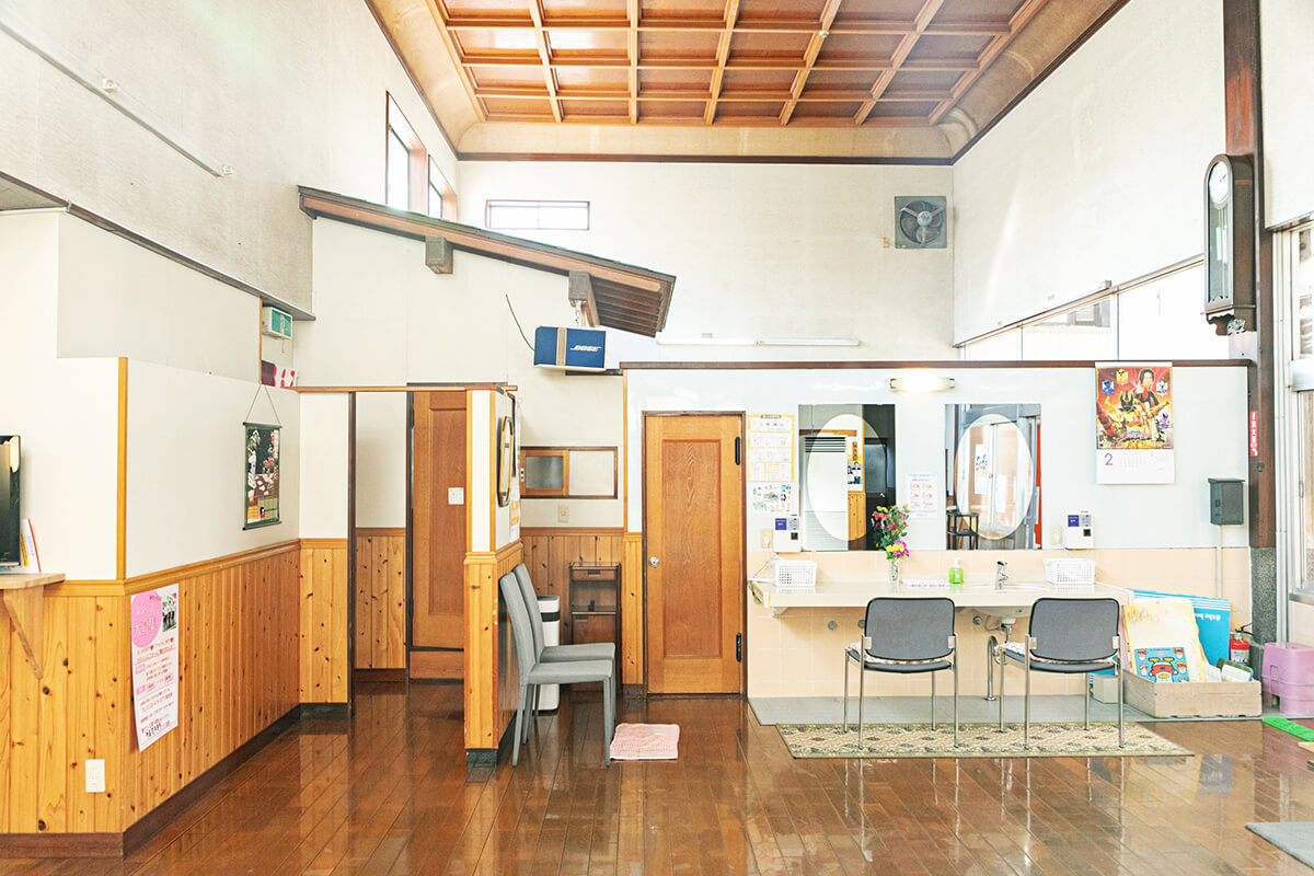 到着すると「ここが銭湯!?」と立派な宮造りの建物に驚かされます。建てられたのは、昭和13年(1938)。内装や設備は何度かリノベーションされていますが、外観にはほぼ手が加えられておらず、建築当時のままだそう。「関東大震災の後ぐらいから、都内ではこういった神社仏閣のような千鳥破風を採用して建てられた銭湯が流行ったらしいんですよね」と、三代目の松本康一さん。ちなみに「タカラ湯」の創業は、この建物ができる10年ほど前の昭和2年(1927)のことだとか。昭和13年(1938)に松本さんのおばあさんがこの建物を建てたそうです。