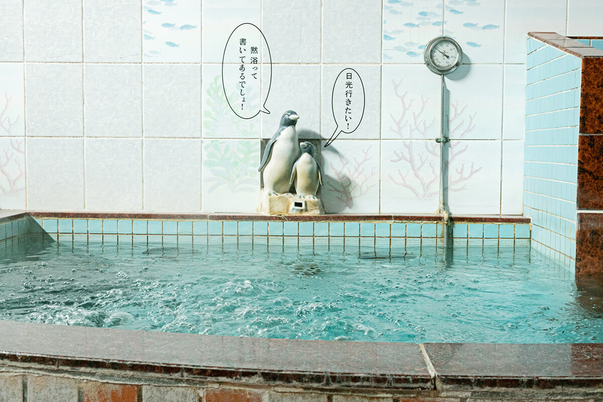 入り口看板の「ペンギン風呂」の答えが、ここにありました。ペンギンのオブジェからお湯が出ていることから「ペンギン風呂」とよばれていたんですね。女湯・男湯ともに、湯船はバイブラ装置のついた座風呂、赤外線風呂(超音波風呂)、電気風呂、日替わり薬湯、ゲルマニューム水風呂があります。お湯は熱めの44~46℃に設定されていますが、かつては飲料用であった井戸水を使用しており、肌あたりがやわらかいと評判です。