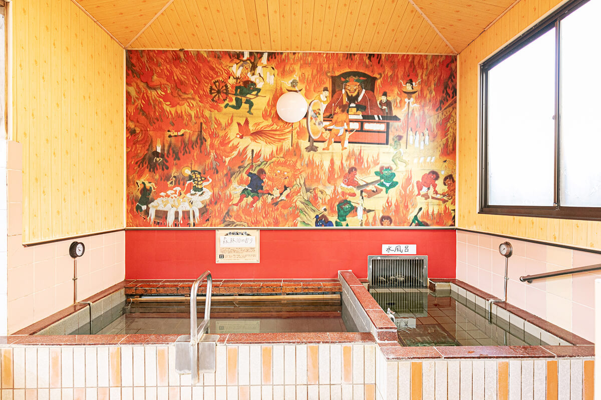薬湯と水風呂の壁には、印象的な地獄絵図が描かれています。これは、閻魔大王が祭られている北千住の勝専寺にちなんだもの。こちらもイベントのプロジェクトで掲げられたものだそう。