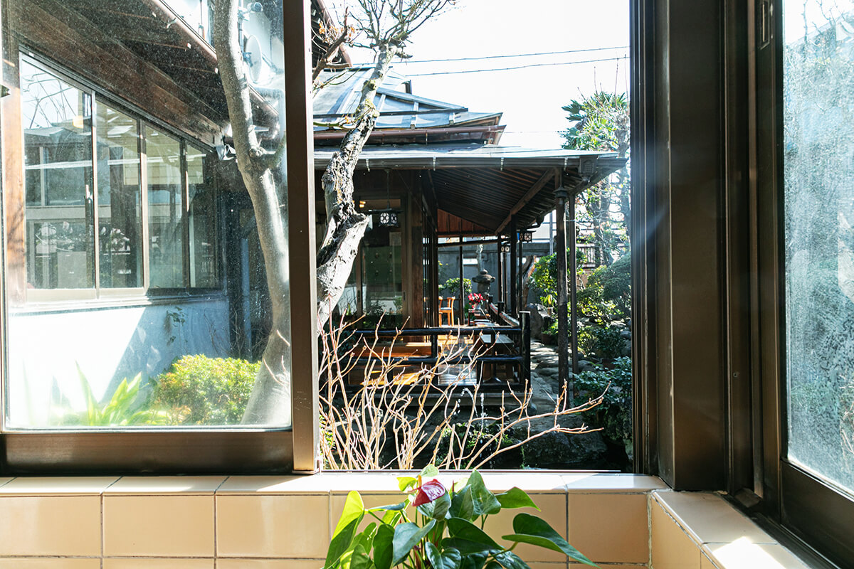 男湯側からは縁側と庭園を眺めることができます。一代目であった松本さんの祖父が庭師をしていたことから、ここまで立派な庭になったのだそう。「今はまだ緑が落ち着いていますが、春から夏にかけて勢いよく芽吹くので、都度剪定をしています」と三代目の松本さんは話します。