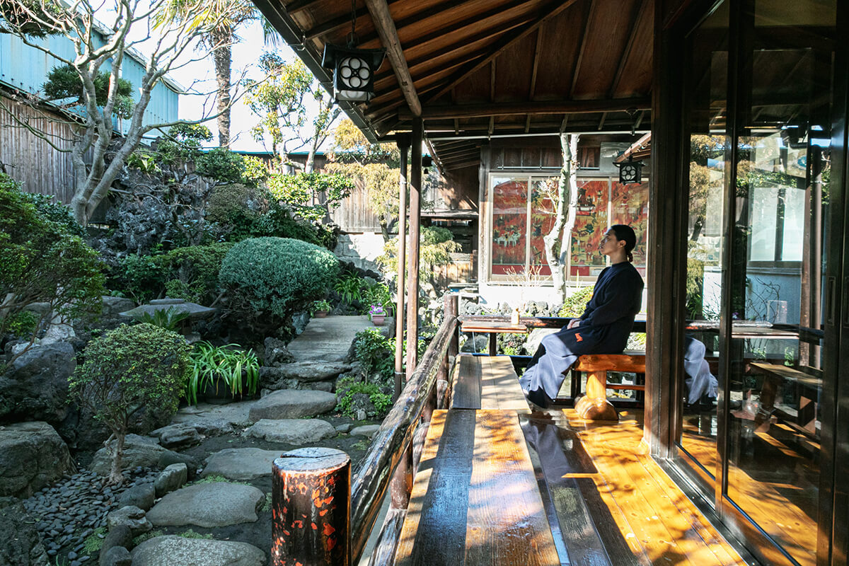 気になる縁側に出てみました。今回は撮影のため洋服を着ていますが、脱衣所と直結しており、裸で出入りすることができます。長く延びた廊下の前には、手入れされた立派な庭園が広がります。腰かける場所もたくさんあり、みな思い思いにととのいの時間を過ごしているとか。吊るされた風鈴がチリンと鳴る音に、じんわりとととのっていきます。夜は吊るされた灯がともり、また違った風情が。まるで、旅先の老舗旅館にいるかのよう。