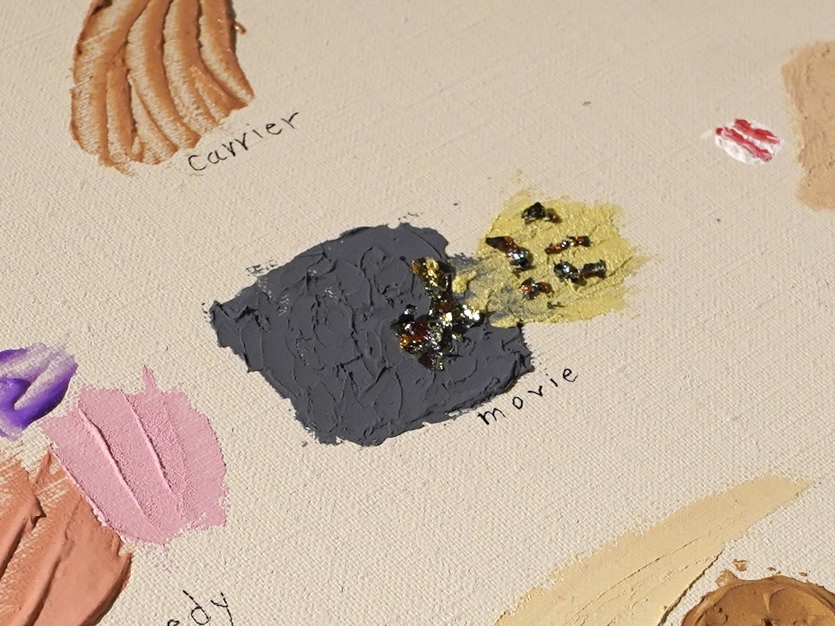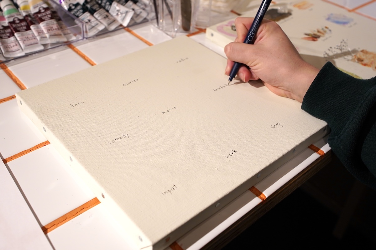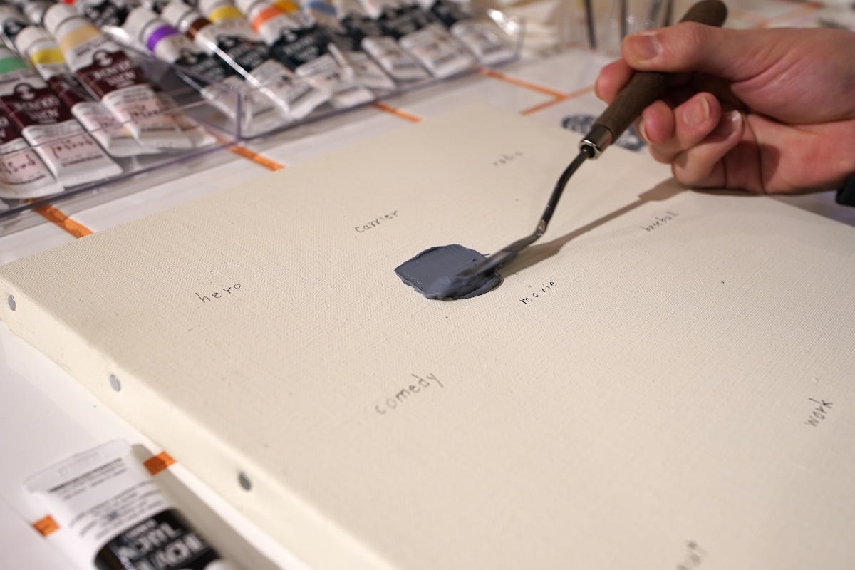 最初のキーワードは「映画」。真っ暗闇のなかのスクリーンに浮かぶ夢のような映像をイメージして、まずはグレーを大胆にパネルにのせます。慣れないペインティングナイフと筆に苦戦しながらも、なんとか形に。