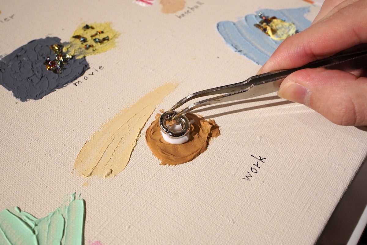アイシャドウと透明度のある盛り上げ材を混ぜ合わせると、絵の具では出せない独特な質感と色味が誕生しました。光に当たると輝くラメがとってもキュートです。