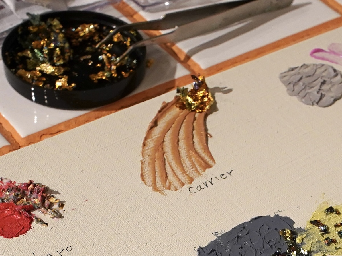 パネルにのせる塗料は絵の具と盛り上げ材を合わせて作成。つるつる、ざらざら、テクスチャがある2つの盛り上げ材は、どちらも絵の具と混ぜると立体感が生まれます。透明度のある盛り上げ材は石やアイシャドウなどアイテムを接着するために使用。それぞれの質感を生かして自分なりの表現をしてみて。