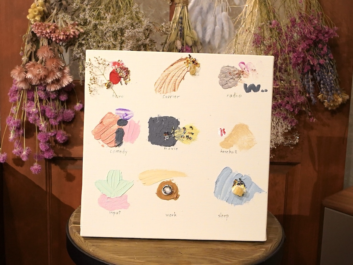 オプション料金を支払えば、箔や石、ドライフラワーなど約20種のなかからアイテムのトッピングもできちゃいます。塗料では出せないニュアンスを加えることができ、アートパネルを一層豪華に仕上げたい人におすすめです。