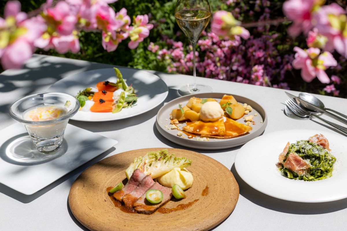 前菜は桃の枝をチップにした瞬間燻製。スープは桃の花のジャムを加えたソースで彩りも豊かに。メインディッシュは、甘露煮にした若桃をソースに使用したローストビーフ……どれもとってもおいしそう! 桃の成長に思いを馳せながら、それぞれの素材を生かした料理とワインペアリングを楽しむことができます。