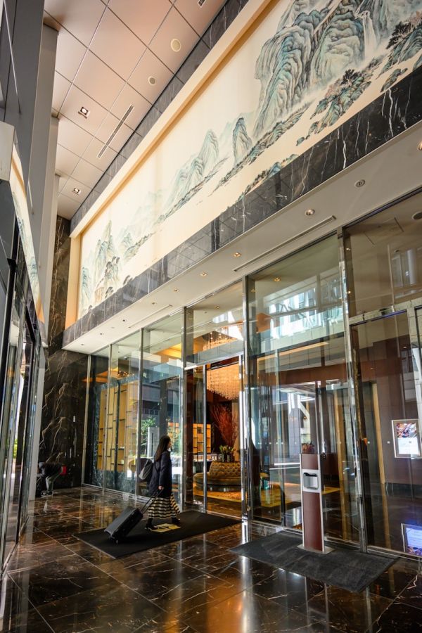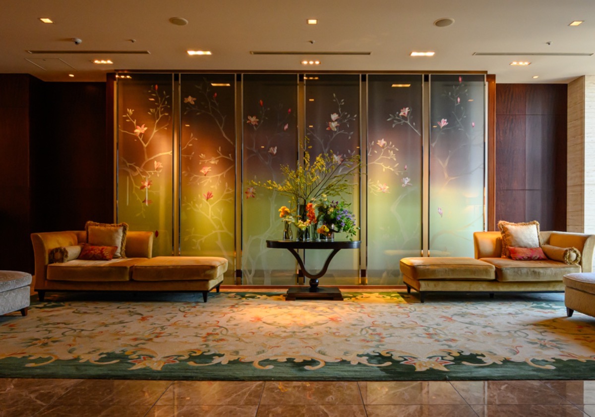 レセプションやレストラン、客室はビル最上部の27〜37階に位置するため、エントランスからはエレベーターを利用します。28階のロビーは、エントランスの豪奢さに比べると落ち着いた印象。エレベーター正面に飾られた6幅の刺繍は、中国の伝統的な工芸品である蘇州刺繍によって作られたもので、こまやかな手作業が見事な大作です。
