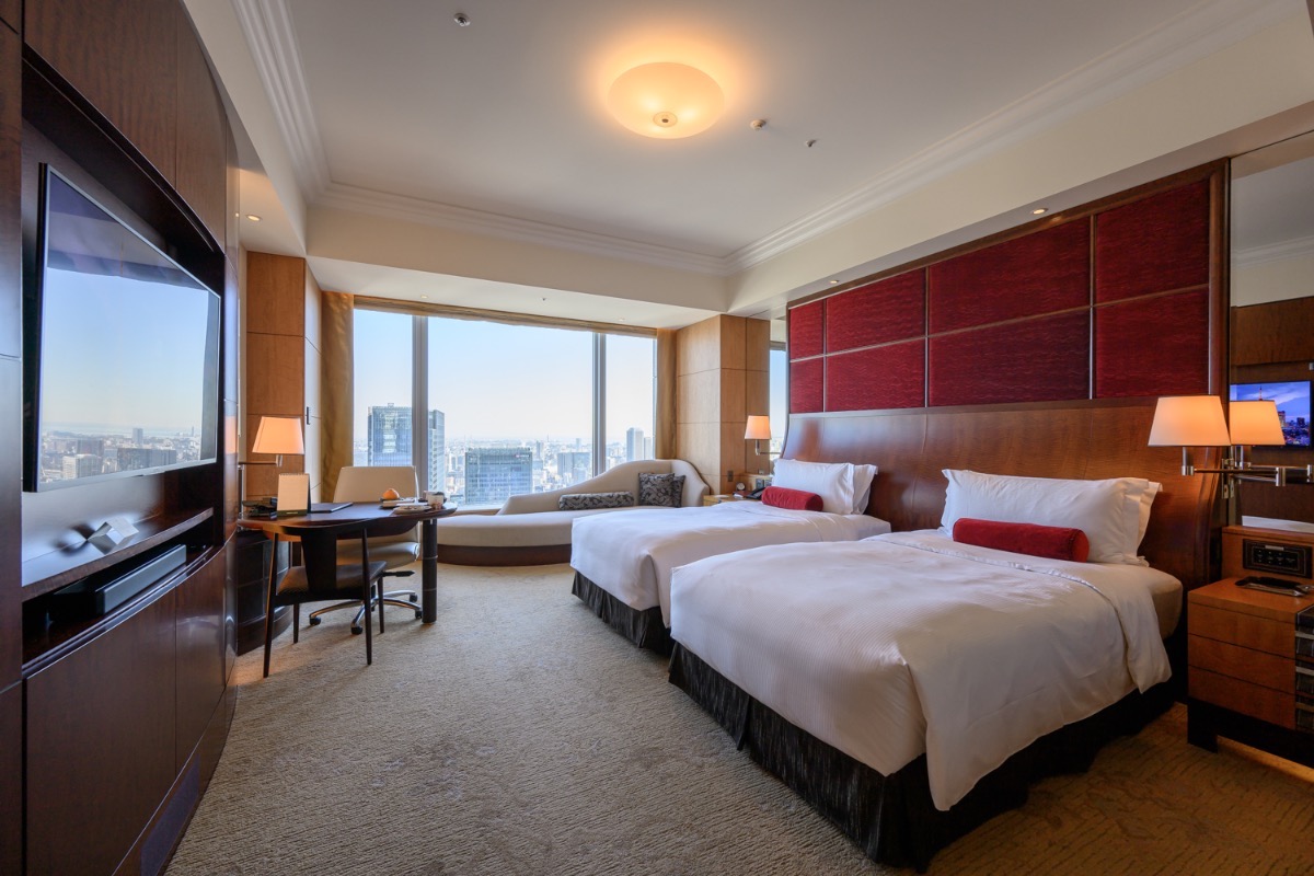 こちらが宿泊するデラックスルームです。部屋に入った最初の印象は「広い!」。なんと50㎡もあります。10畳のお部屋が18㎡なので、その約3倍。スイートではないスタンダードな客室でこの広さに驚きます。ダブルサイズのベッド2台とカウチソファ、デスクセットが置かれてもまだ人がすれ違えるほどゆとりがあります。