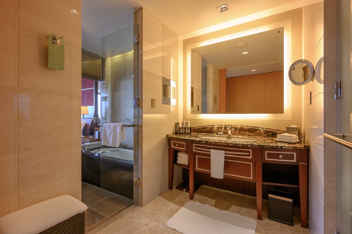広いお部屋の中でもさらにゆとりを感じるのが、この豪華なバスルーム。大理石の大きな洗面台は、アメニティ類が引き出しに収められているから、持ってきた化粧品を広げるスペースもたっぷり。洗面台が広い分、鏡までやや距離があるので、近くに拡大鏡があってお化粧がしやすいです。