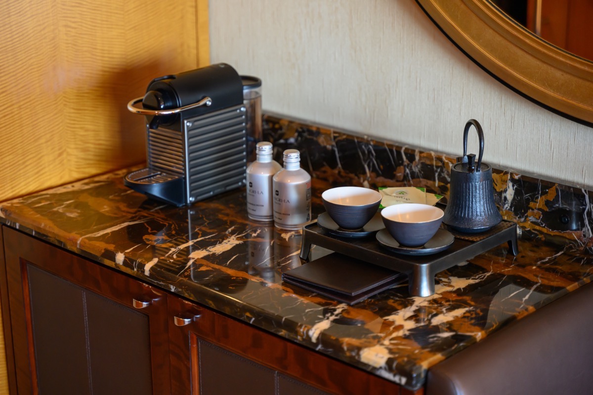 ミニバーは、御膳風のトレーの上に南部鉄器のティーポットと湯飲みが2客。煎茶は京都「一保堂茶舗」のティーバッグです。コーヒーはもちろんネスプレッソ。