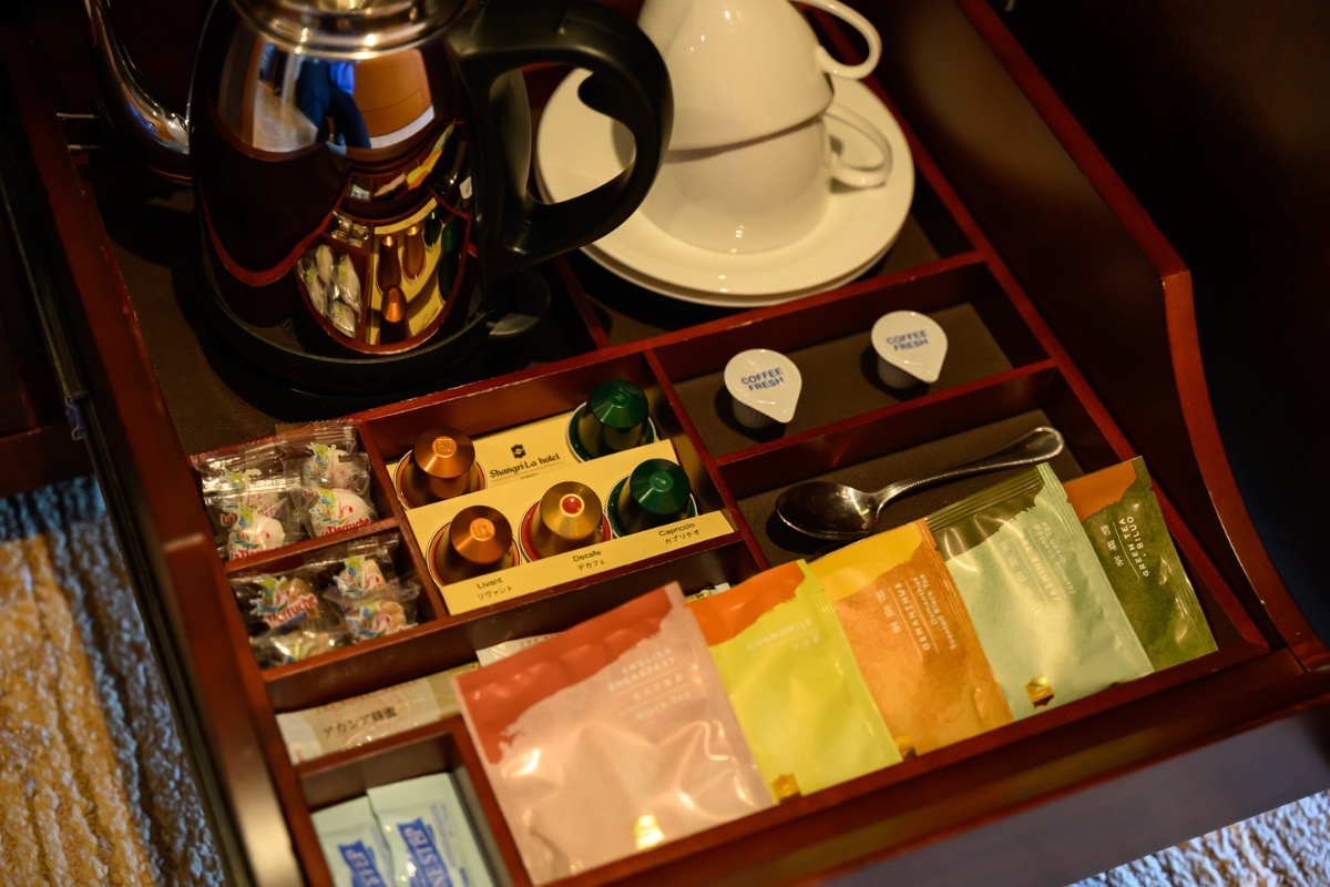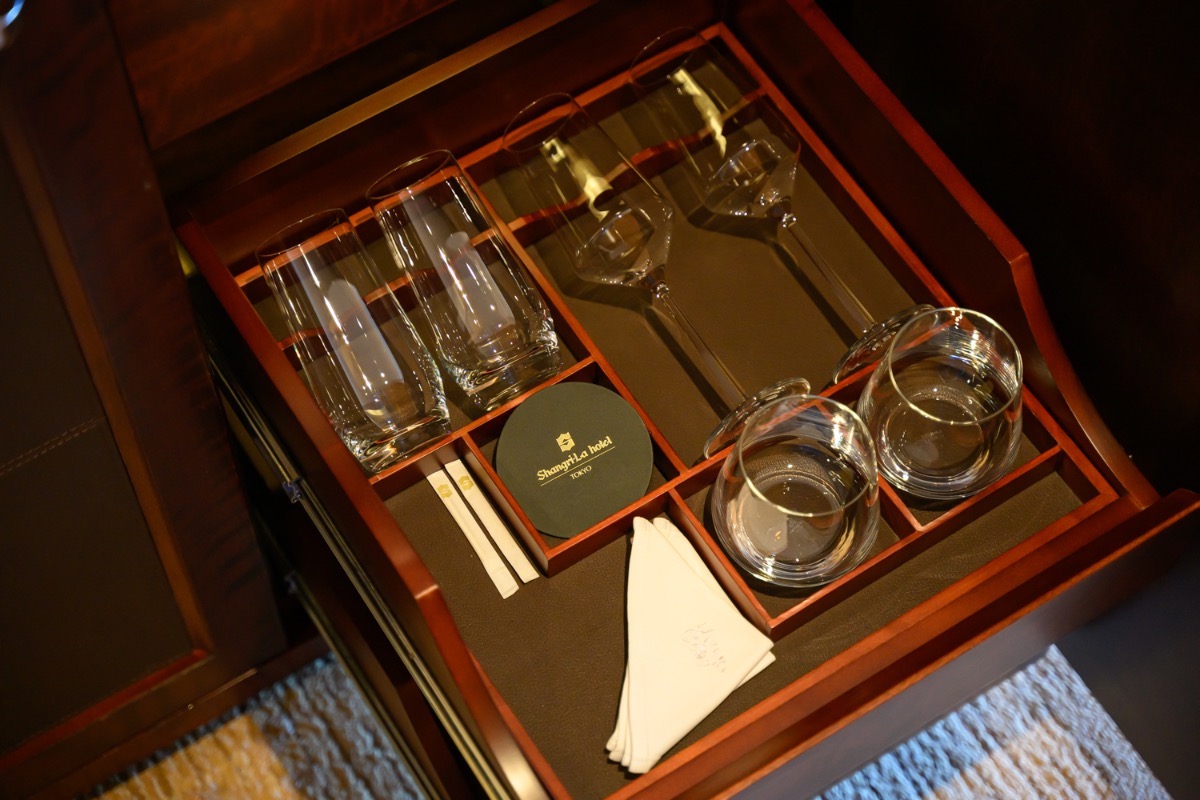 キャビネットの扉を開けると引き出しがあって、ブラックティー、カモミールティーのほか、茉莉花茶や桂花茶、碧螺春(へきらしゅん)などの本格中国茶のティーバッグが揃っているところに香港拠点のホテルらしさを感じます。コーヒーカップやグラスのほか、ワイングラスもあります。